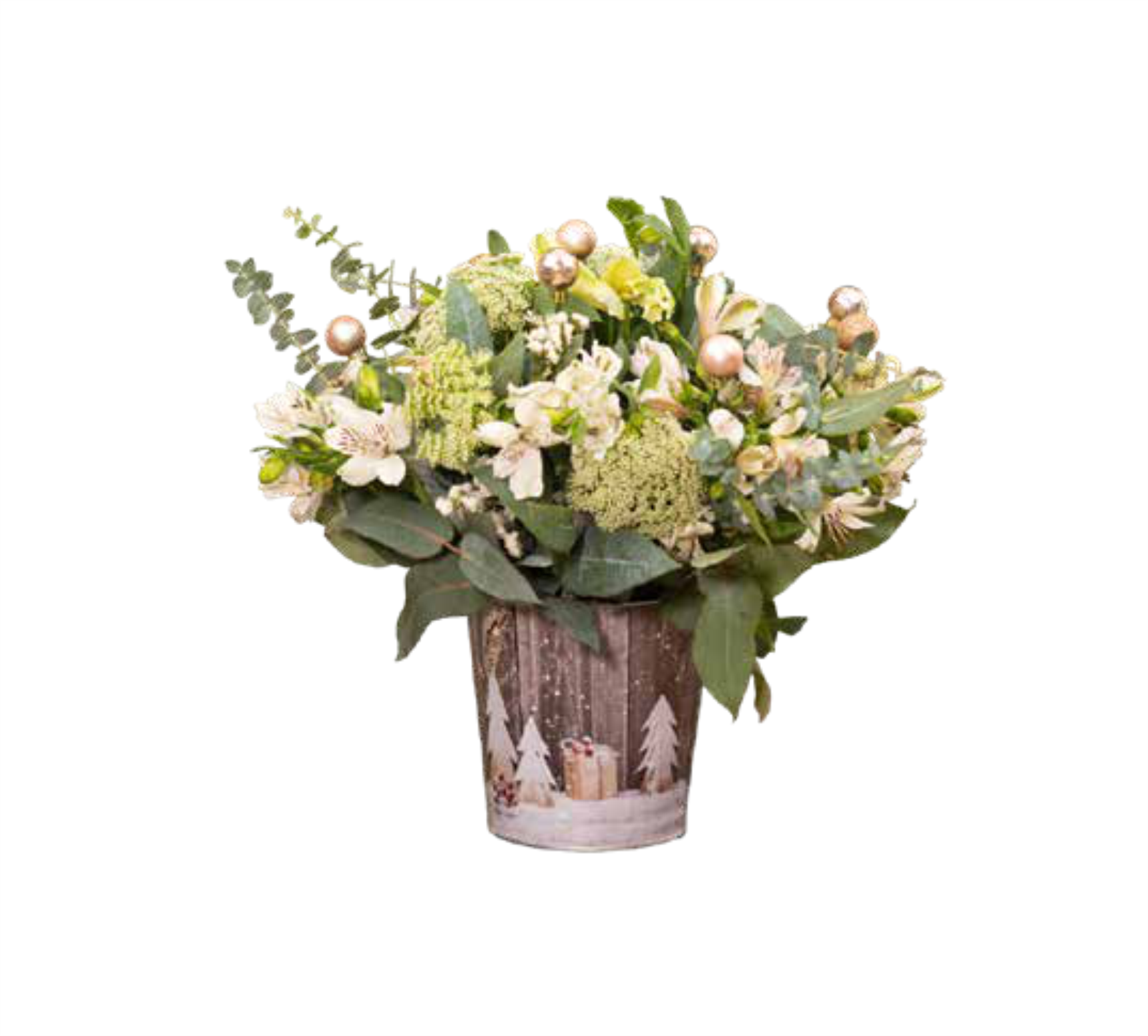 Mix de astromelias y follajes en bucket con diseño navideño.