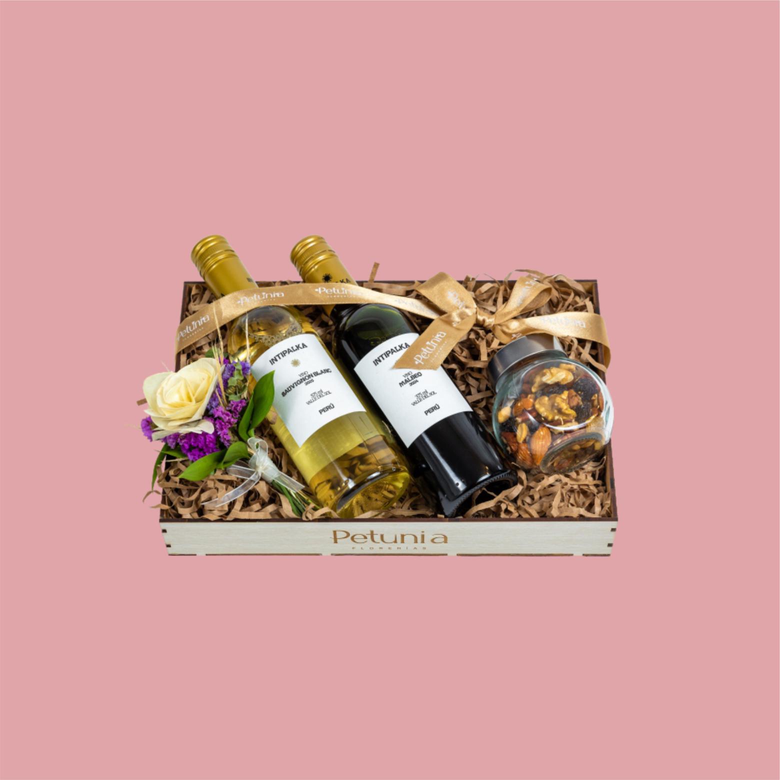 2 botellas de Intipalka de 375ml. (Sauvignon Blanc y Malbec), jar de frutos secos y mini ramillete de flores en bandeja de imitación de madera.