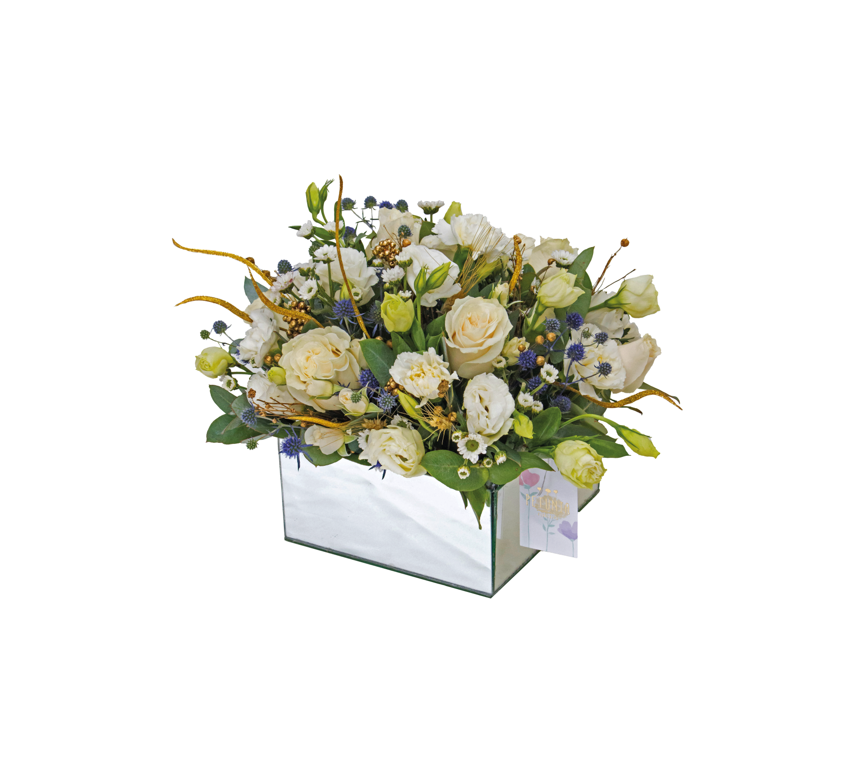 Mix de rosas y follajes con decoración navideña en base de vidrio espejo.