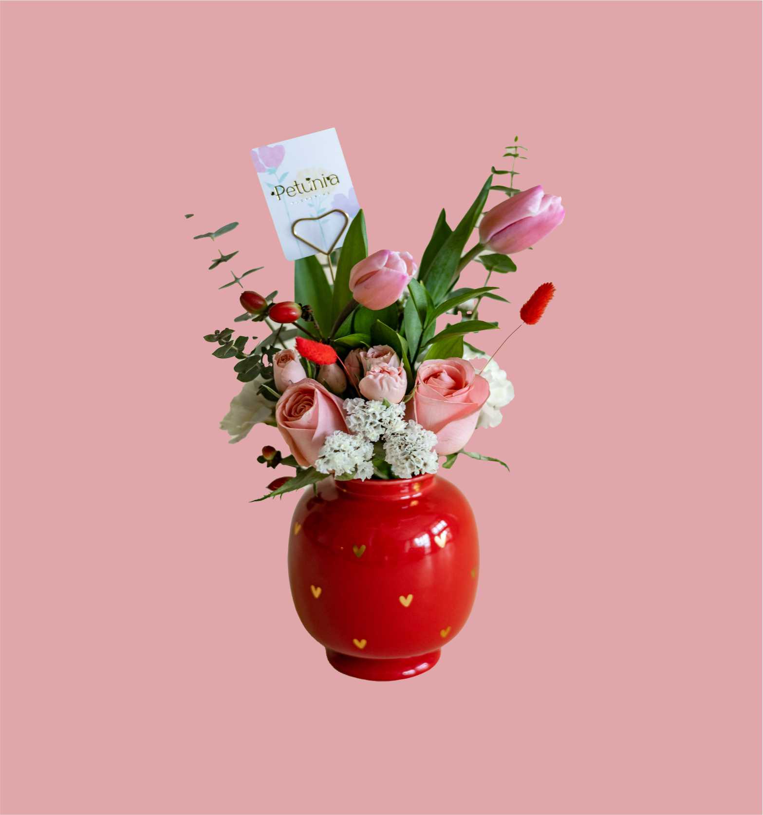 3 Rosas, 2 tulipanes, flores complementarias y follaje en lindo florero.