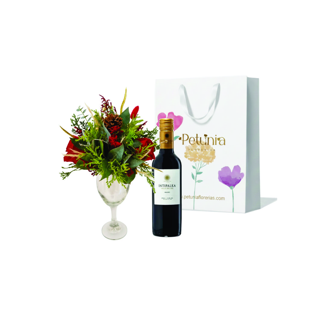 Arreglo floral en copa de vino + botella Vino Tinto Malbec Intipalka 375ml.