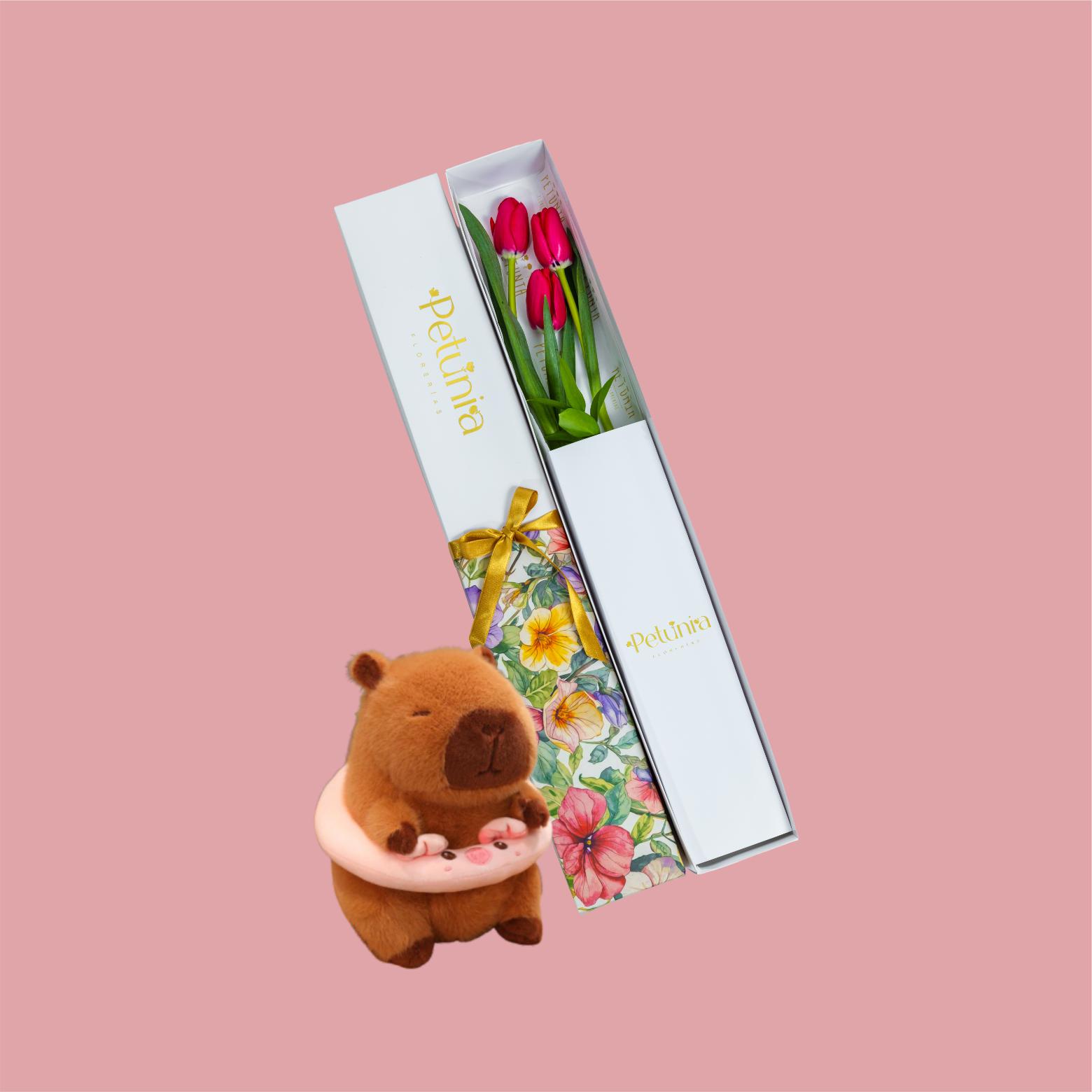 Caja de 3 tulipanes + peluche pequeño 45cm