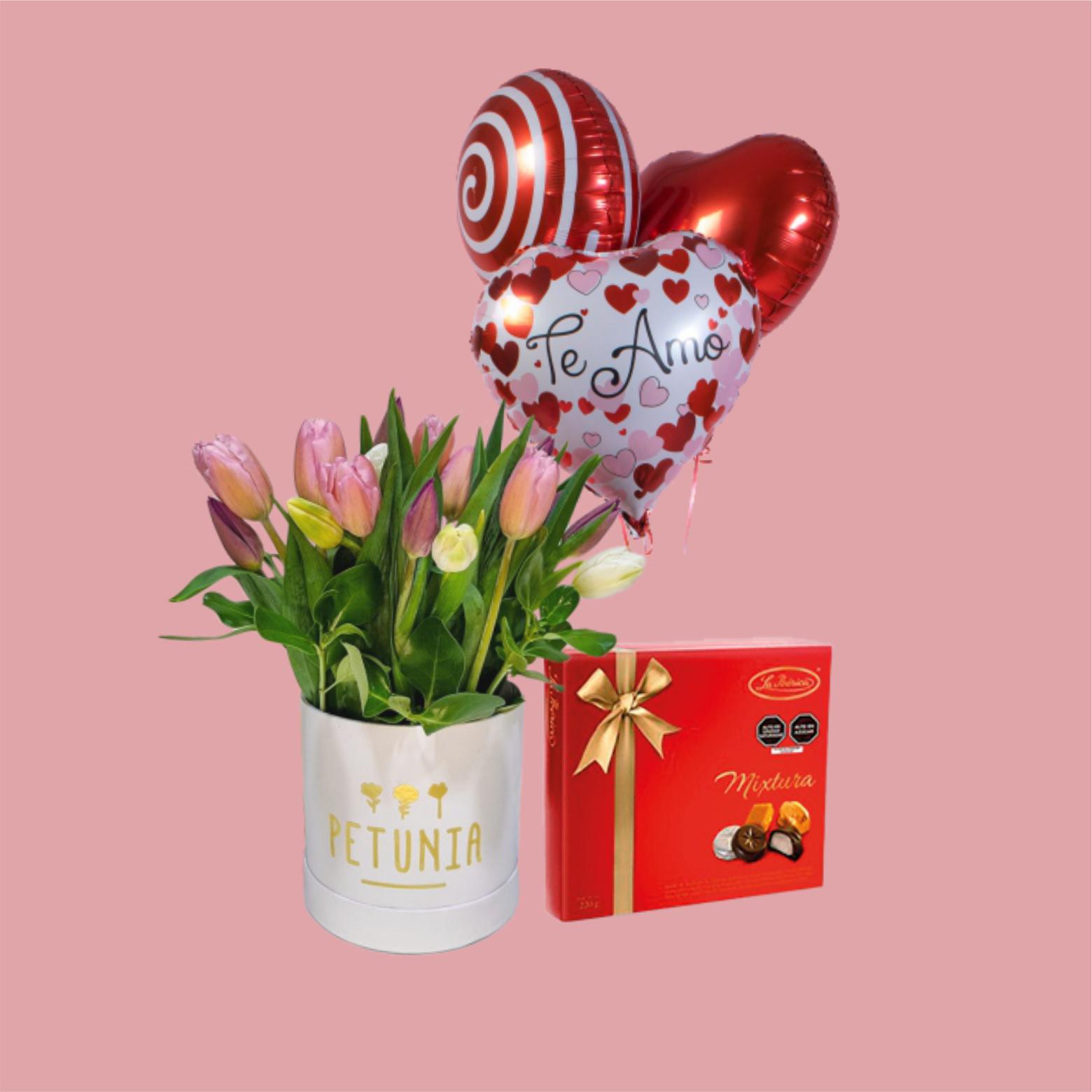 Classic box con 20 tulipanes + Pack de 3 globos con helio + chocolate Mixtura La Ibérica x 220gr.
