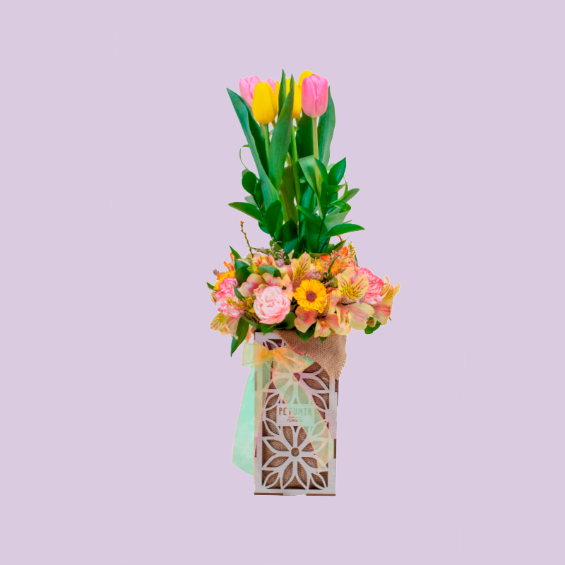6 tulipanes (3 tulipanes amarillos + 3 tulipanes color complementario)  flores complementarias y follaje.