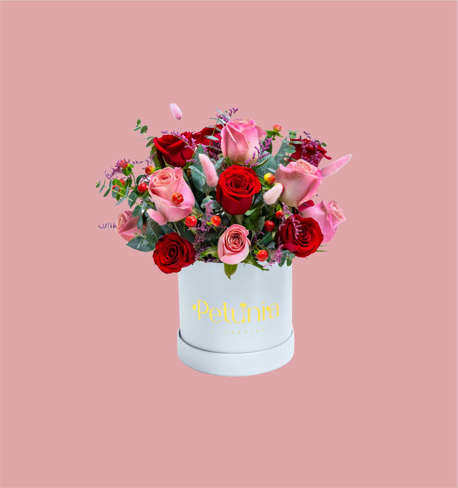 Classic box con rosas rojas y rosadas, flore complementarias y follajes.