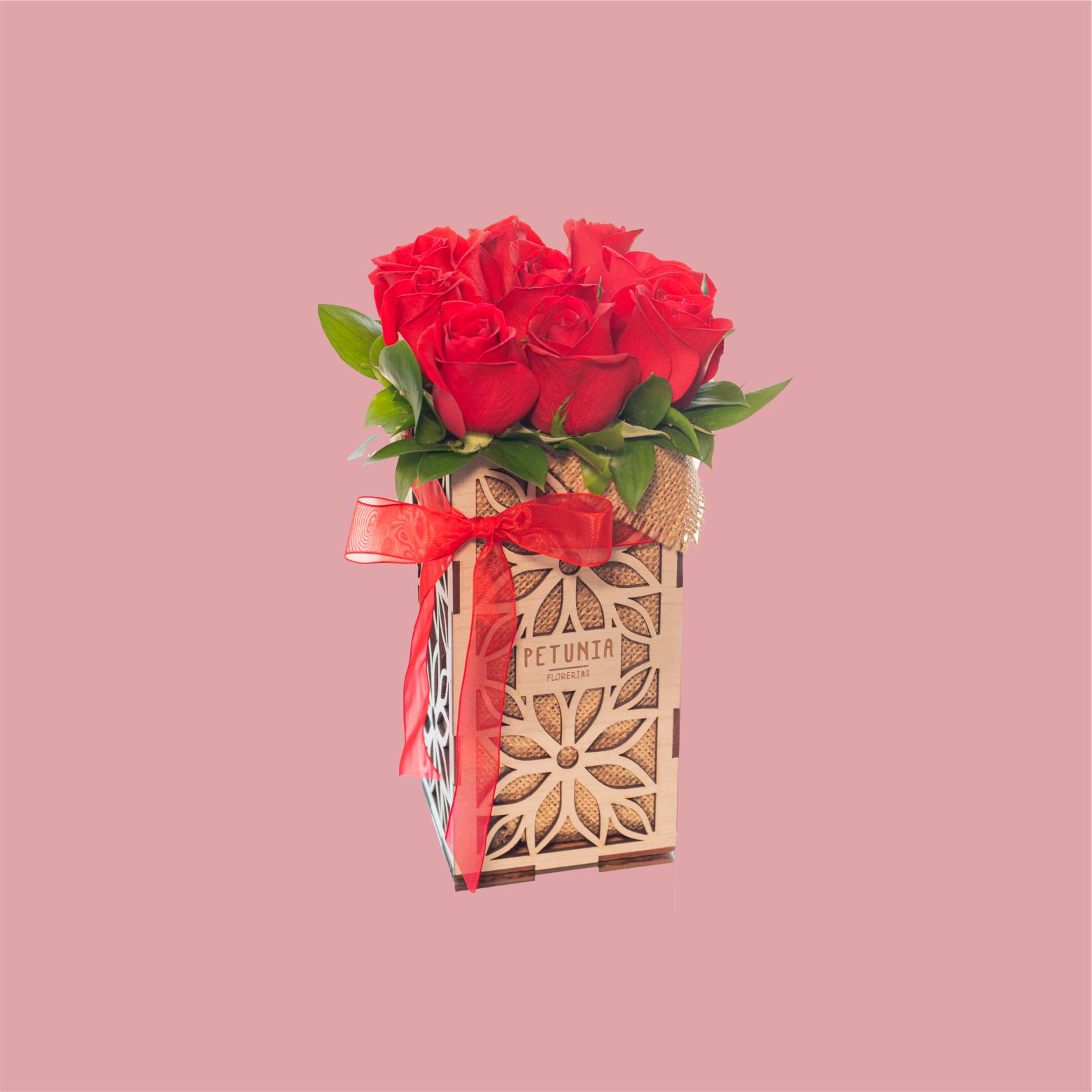 9 rosas y follaje en caja de imitación madera estilo vintage.